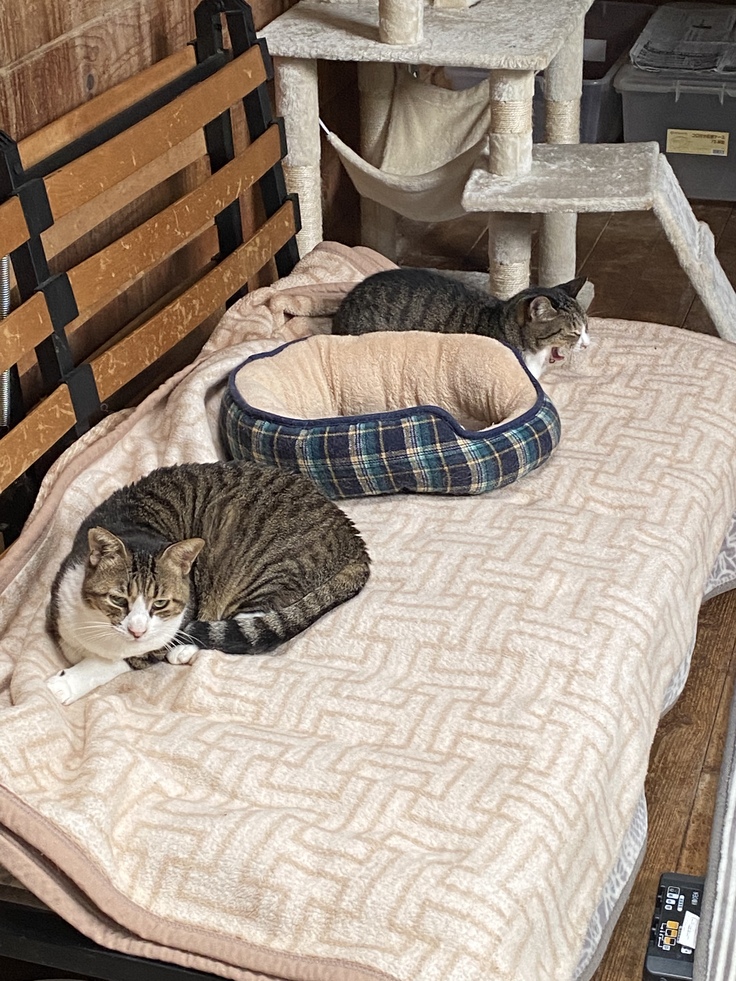ヒメ(2歳 メス)/ポテチ(19歳 オス)/トキオ(10歳 オス)/ナゴミ(10歳 メス)/木木(7歳 メス)/ちびた(1歳半 オス)/他、外猫2匹