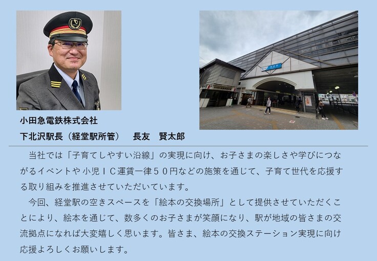 小田急電鉄株式会社が経堂駅にて絵本交換スペースの常設イベント(約3ヵ月)を実施する。集まった資金は、本棚購入費、絵本購入費などに使用します。