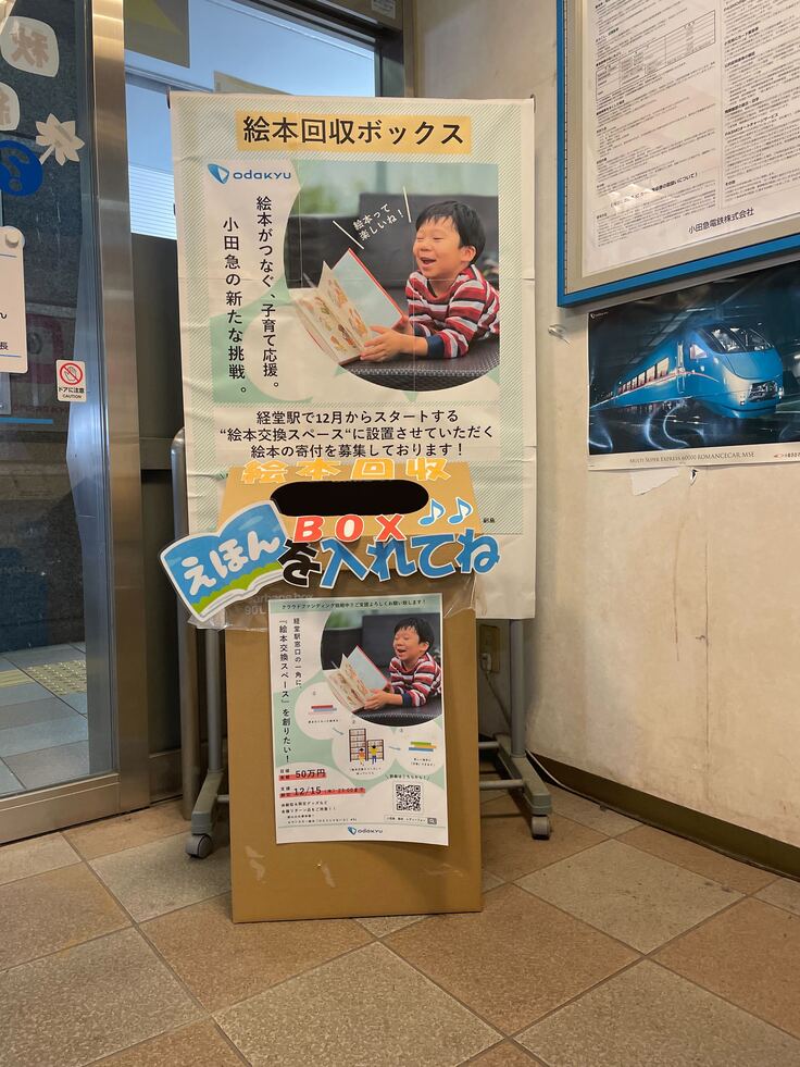 また、現在経堂駅の出札窓口には、プロジェクト達成後に陳列する絵本の回収BOXを設置しています。
