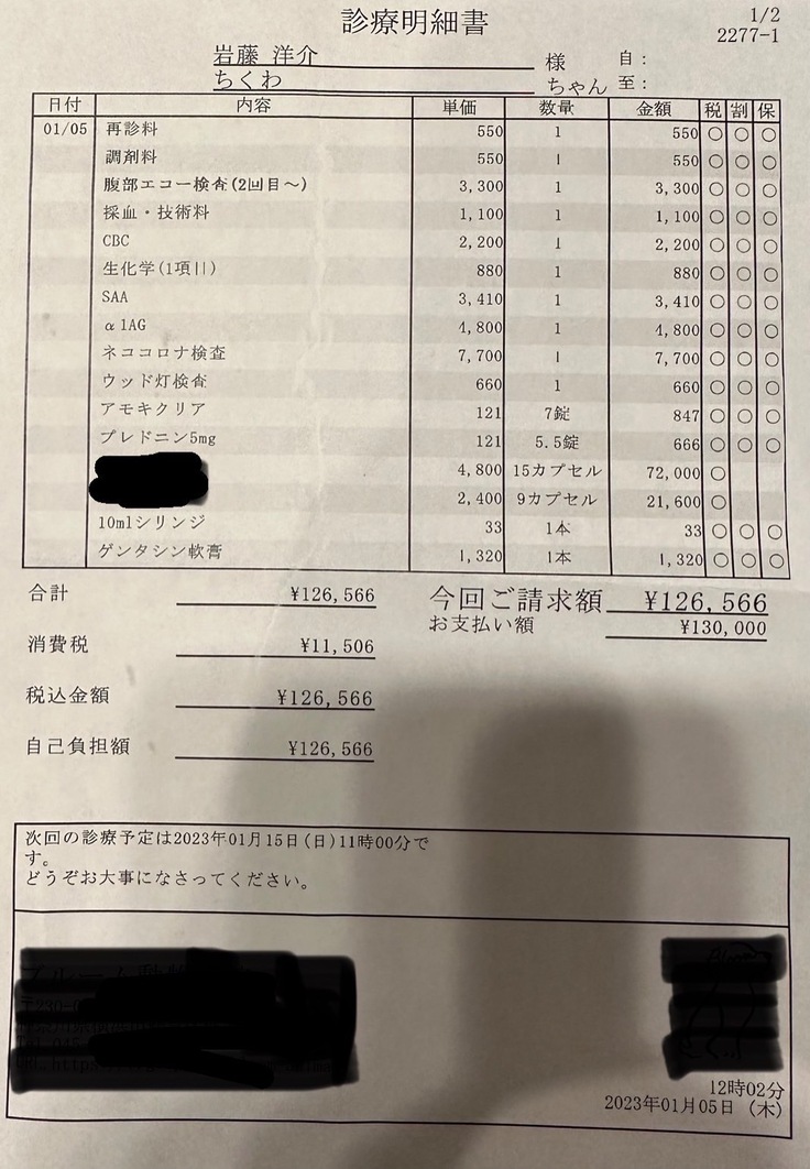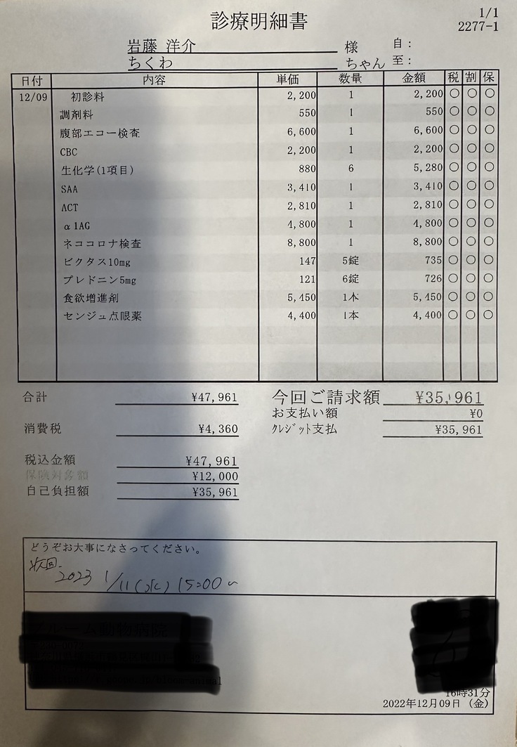 入院時にお世話になっていた病院に連れていき、すぐに11月29日にしたものと同じ検査をすべて行いました。FIPの典型的な症状の一つである、総蛋白の上昇はないものの、白血球とSAA(血液中の炎症反応値)の上昇と、熱がありました。ここでは原因がわからず、抗生剤の投薬をしてもらい、お家で様子を見ることになりました。