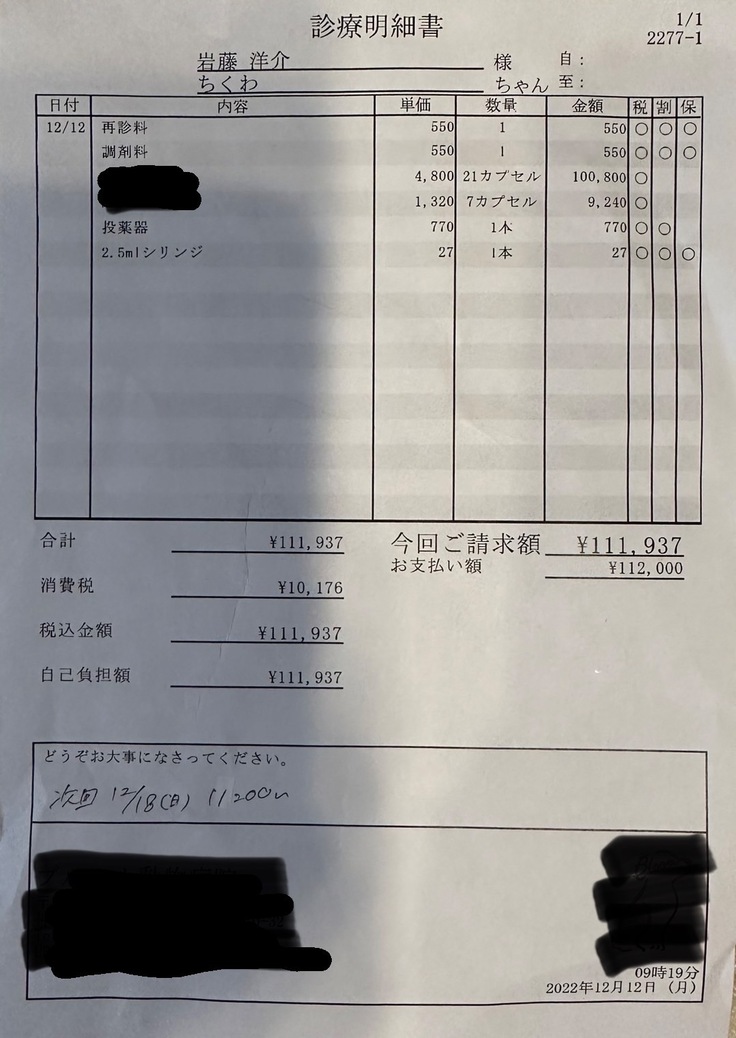 この日までに食欲、元気がなかなか回復しなかったため、朝一で病院に行きFIPの再発だろうということで未認可の薬を処方してもらいまいした。この日の夜から、薬を42日間飲むことになりました。実はこの夜、仕事から帰宅するとちくわが震えていて、目もうつろな状況ですぐに薬を飲ませ、翌日にはだいぶ落ち着きましたがこの日の朝に薬をもらいに行ってなかったらどうなってたんだろうと、今思い出しても怖くなります。