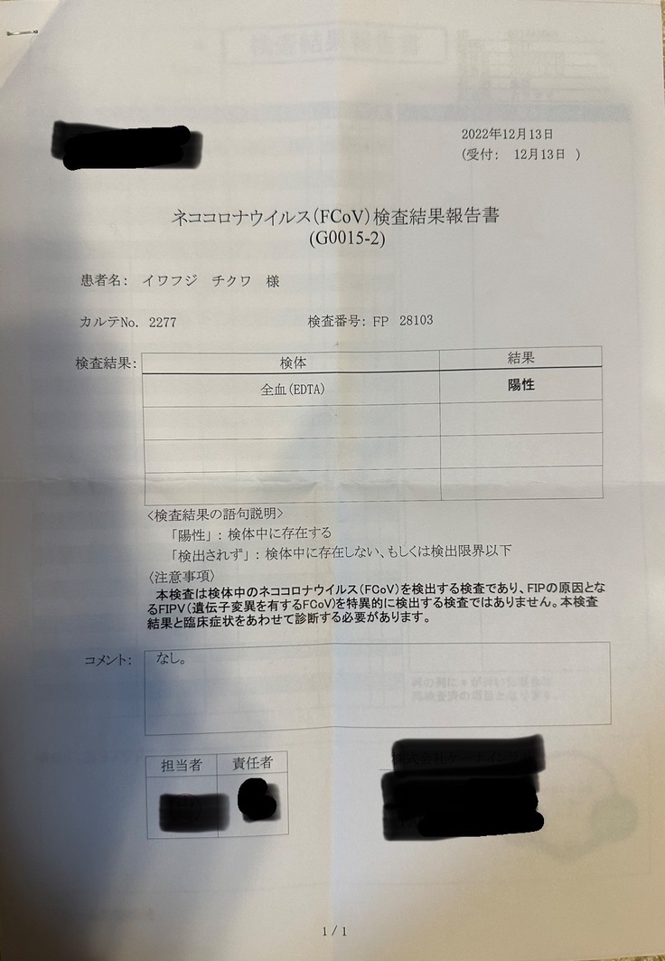 この日からはご飯も食べられるようになり、毛並みと少しづつ、つやつやになりました。この日に出た検査結果は猫コロナ陽性、、改めてFIPの再発と診断されました。