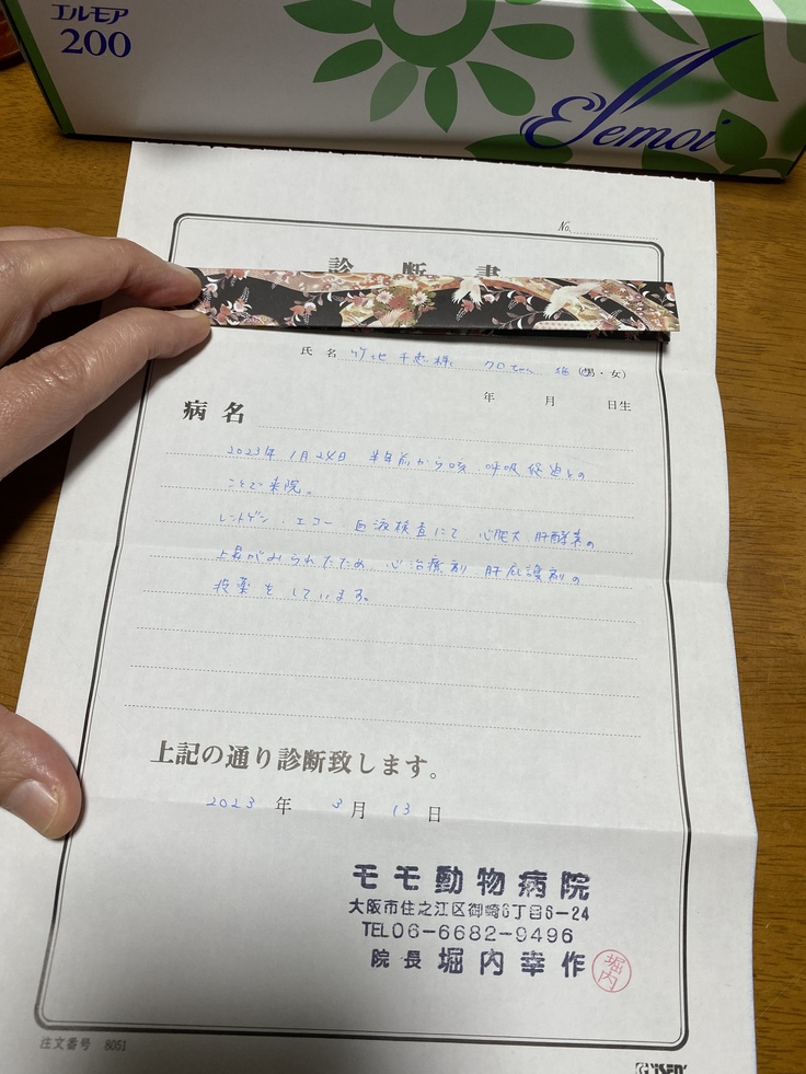 病気のクロちゃん(くぅちゃん)の診断書です。〈知人〉