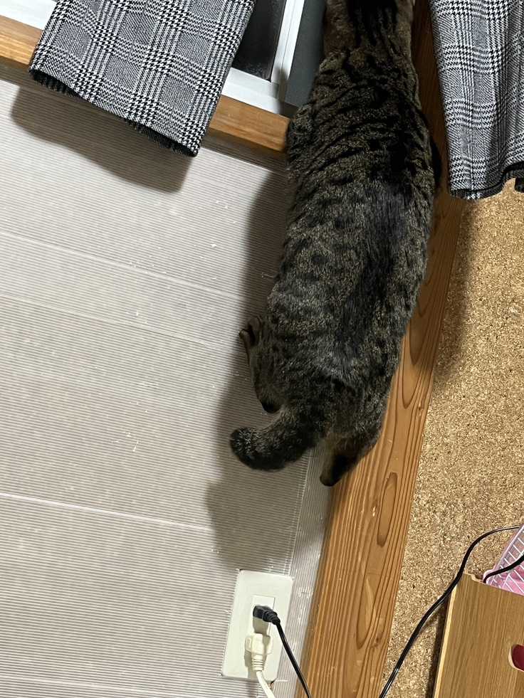 もうひとつ低い窓があるのに高い方の窓から外が見たいのか養生したら爪が引っかかりやすくなったのか登れるように😆