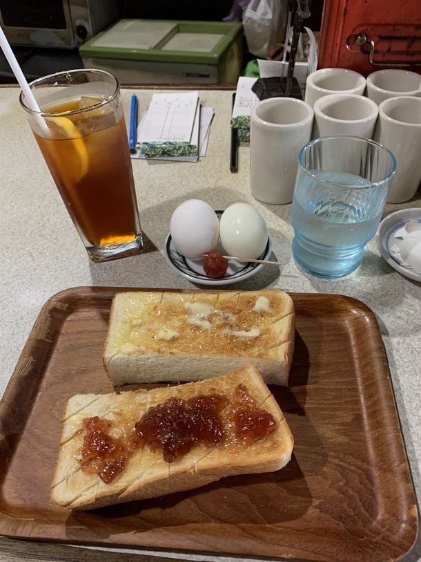 ゆで卵2個、梅干し1つ、厚焼きトースト🍞で帰りに暖かい梅昆布茶を提供してくださいます。