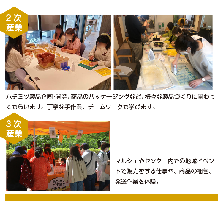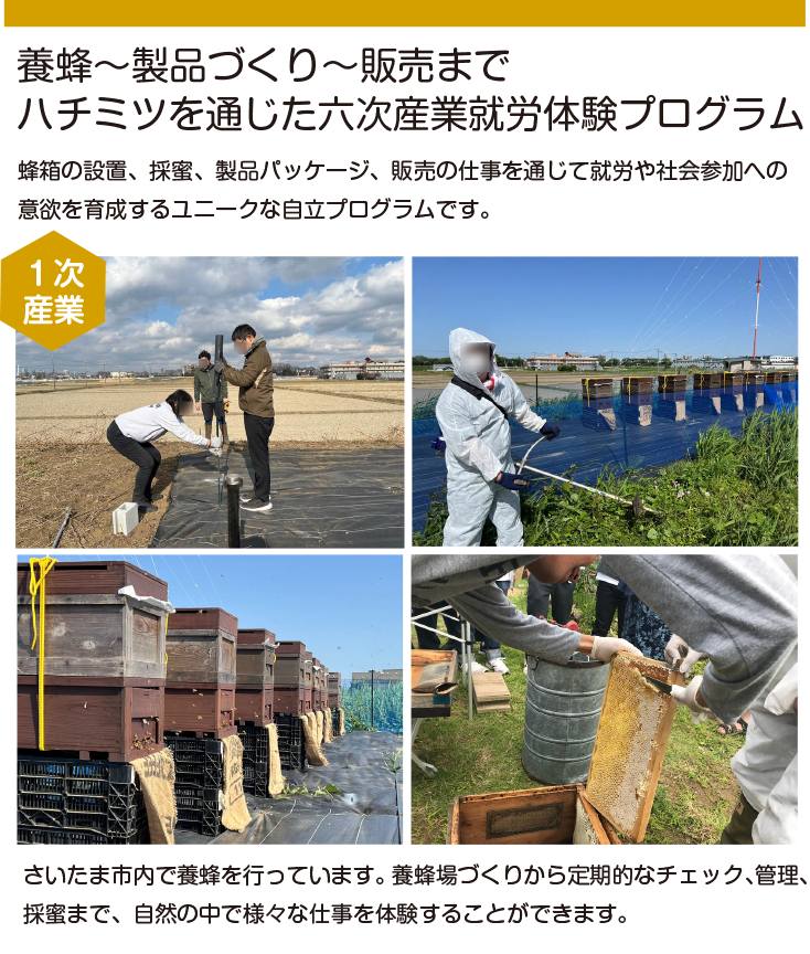①養蜂、ハチミツ製品づくり、販売までの六次産業職業体験プログラム。