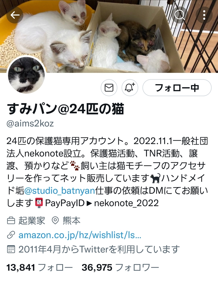 はじめまして!熊本県にて殺処分ゼロを目指し保護猫活動をしております、