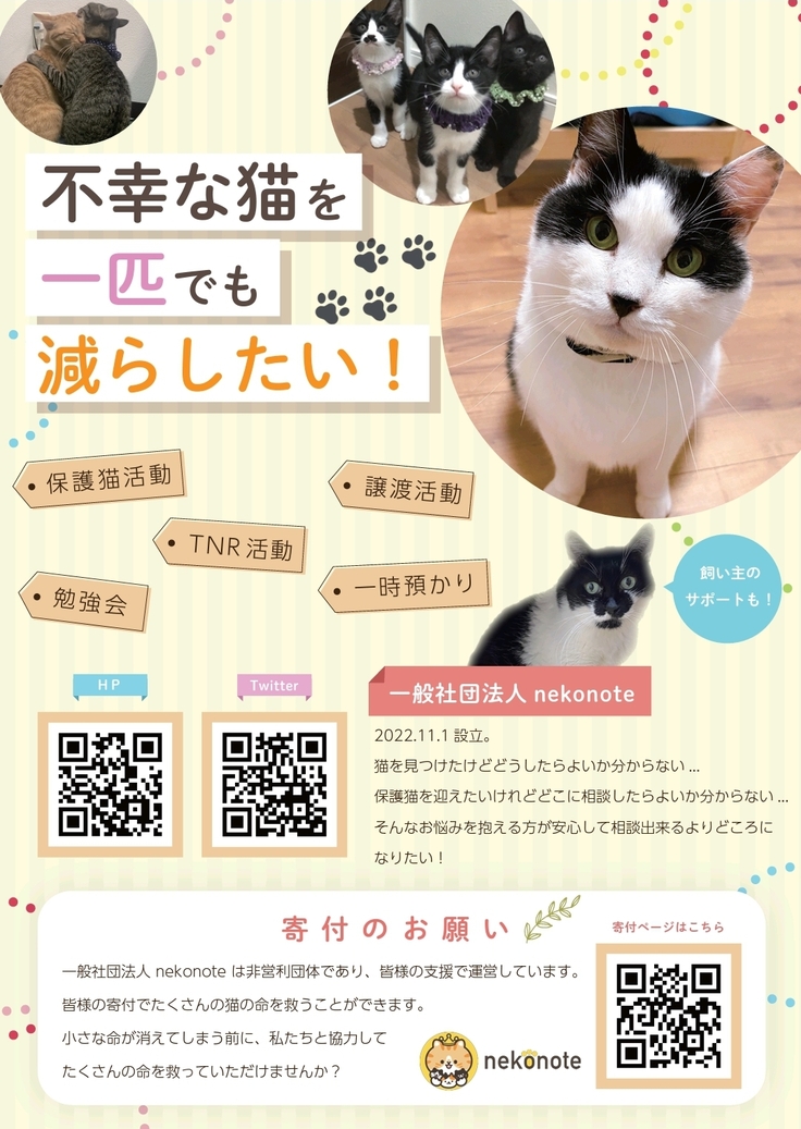 様々な葛藤の中、現状を打開し、より一匹でも多くの傷ついた猫達を受け入れる為、2022年11月に『一般社団法人nekonote』として法人化しました。