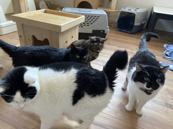 保護したばかりの猫については、獣医師の診断・指示を受けてケージやお部屋で他の猫とは隔離し、触れ合うことがないようにしています。血液検査などで異常がない子は他の子と一緒にお部屋で生活しています。あまり人馴れしていない子は必要に応じてケージで飼育しています。