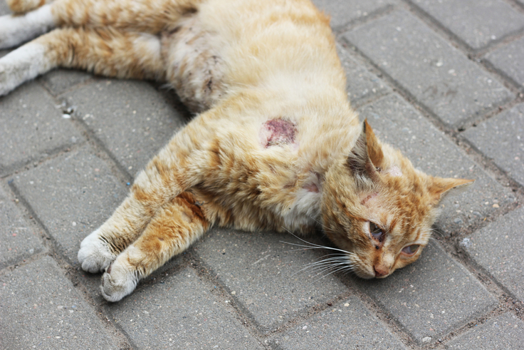 その猫はとても小柄で皮膚がむき出しになり血を流していましたが、元は飼い猫だったのかとても人間に懐いており餌を求め甘え擦り寄ってきました。