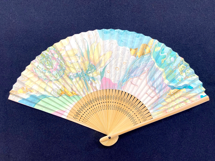安曇野涼風扇子展に出品される扇子は、全て京都の職人の方の手で一本ずつ丁寧に作られています。絵の具や墨をはじめ、さまざまな材料で描かれた作品を、損なうことなく扇子に仕立て上げるには熟練した技を必要とします。