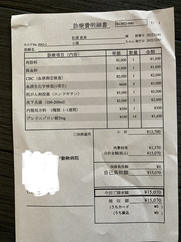 小海(こうみ)の寛解へ向け、約3か月間の週1回の抗がん剤治療を継続する必要があります。