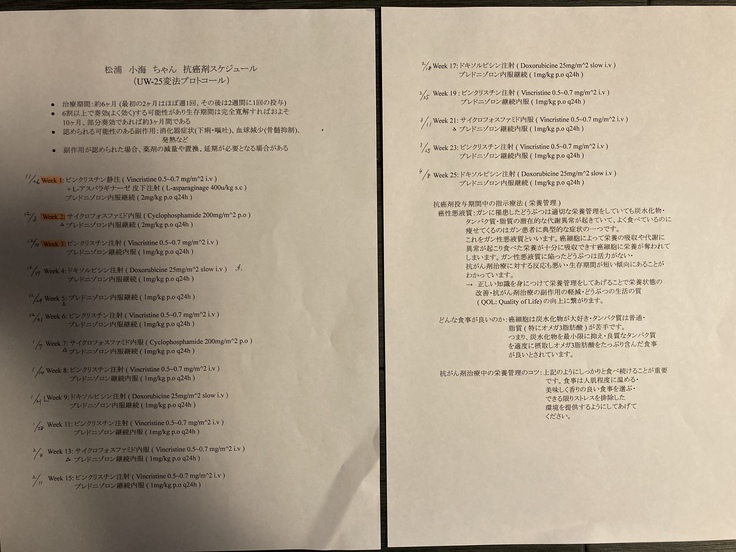 その後、検査結果を見て、抗癌剤投与の反応、経過を確認し、週1回→週2回に抗癌剤治療を減らし、寛解の状況まで持っていけるよう治療予定。