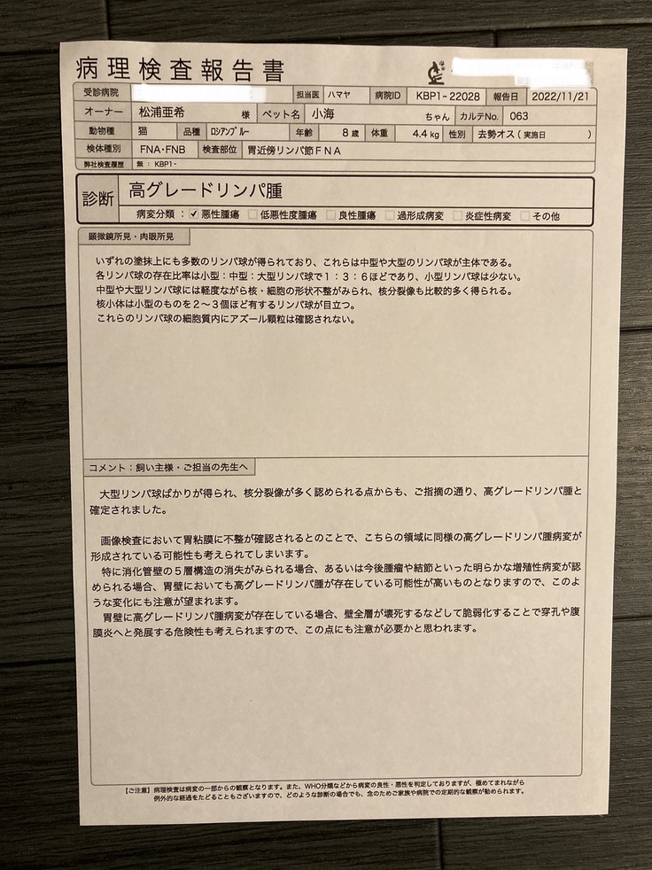 頻繁に吐くようになり、食べることが大好きだった子がご飯を食べられなくなりました。急いで動物病院に連れて行ったところ、検査を行い、不幸にも高ハイグレードリンパ腫との診断を受けました。