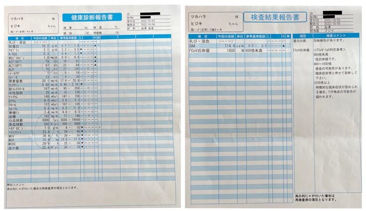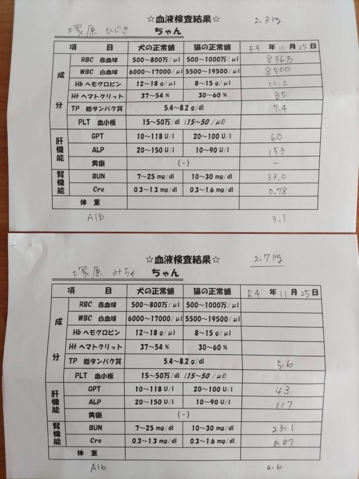 その後、11月10日から兄弟のみちゃも同じような症状が出始め、急いで病院で血液検査してもらいました。