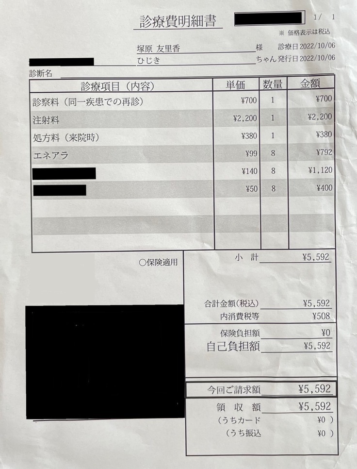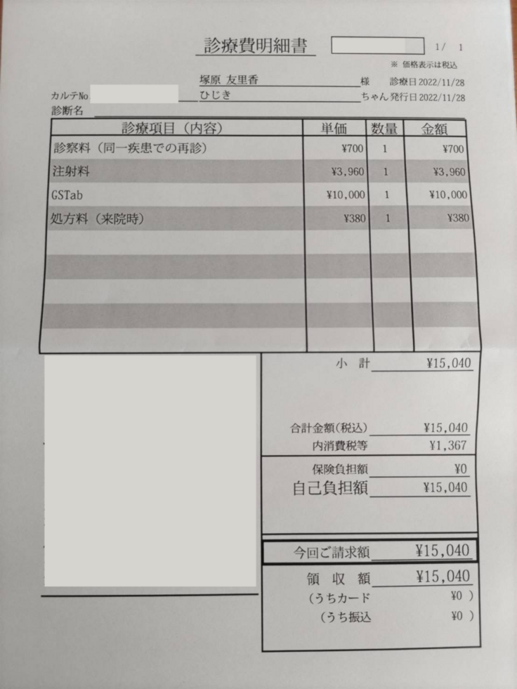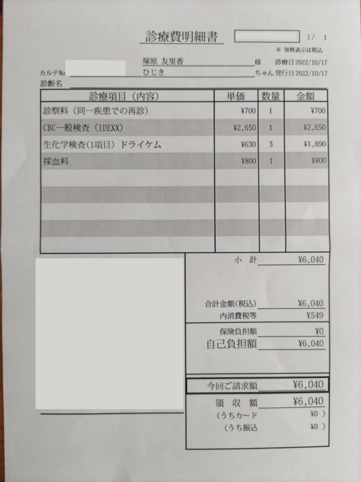 ▼治療を始めたとき(みちゃ2.5kg)の明細書