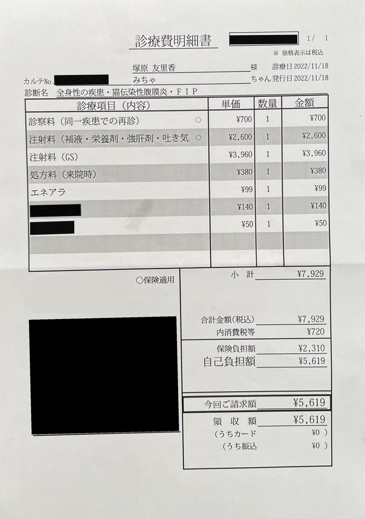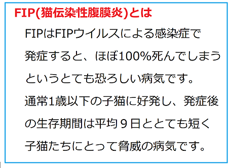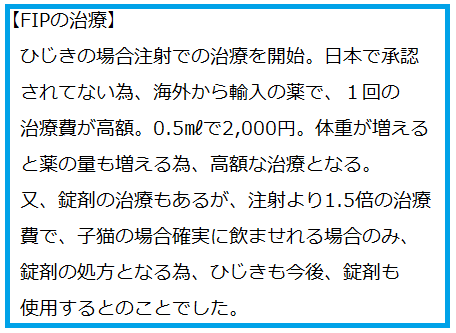 現在日本では、FIPの薬が認証されていなく、海外からの輸入になり保険対象外で高額な為、治療をしてくれる病院も少ないのが現状です。