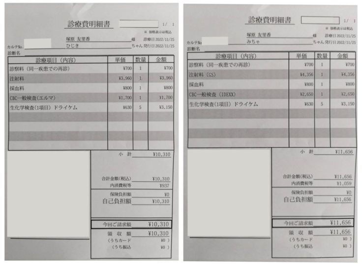 ※ひじきとみちゃは体重が1キロ近く差があったため注射の値段も変わっています。