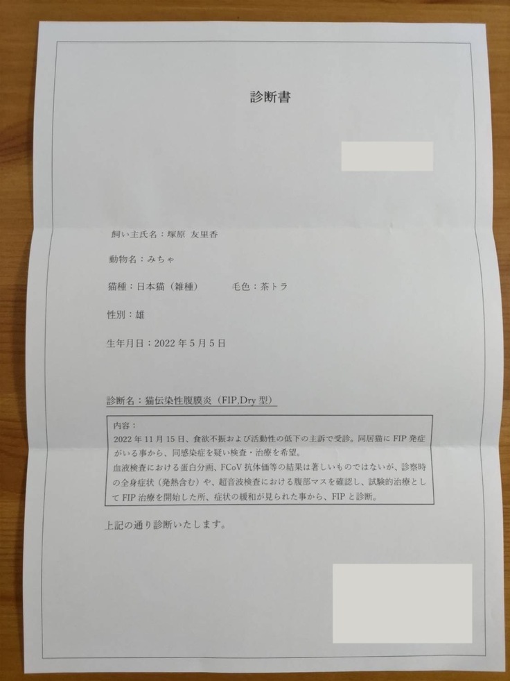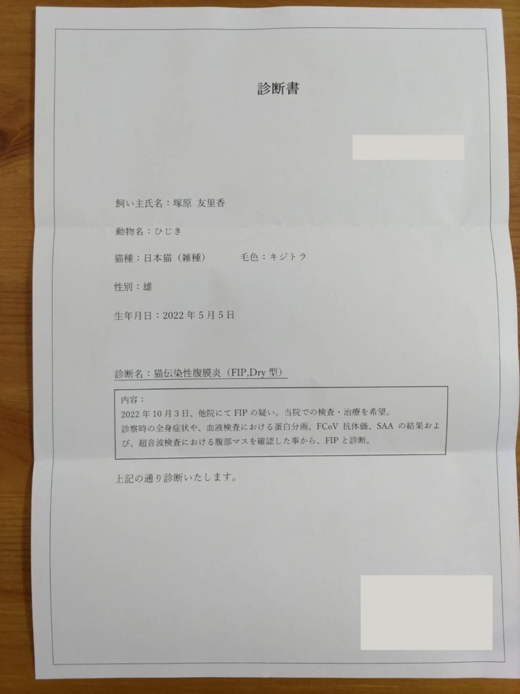 出てみると「FIPのドライタイプの可能性があります。」とのこと。