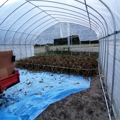 収穫した黒大豆の株をビニールハウスの下で乾燥させます。