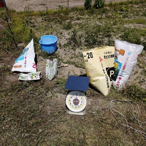 事業所の利用者に2種類の肥料と1種類の薬品を畑に撒いていただきます。畑の大きさによって、撒く量は私が計って用意します。薄く数回撒くことで、まんべんなく撒くことができます。人によって持てる量が違うのでバケツの大きさも数種類用意しました。