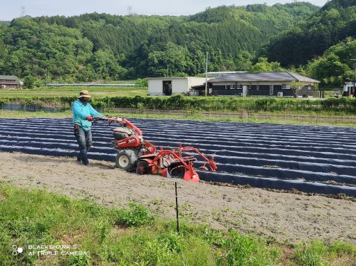 事業所の施肥が終わると私たち家族が耕耘とマルチ張りをします。まさに連携作業なのです。