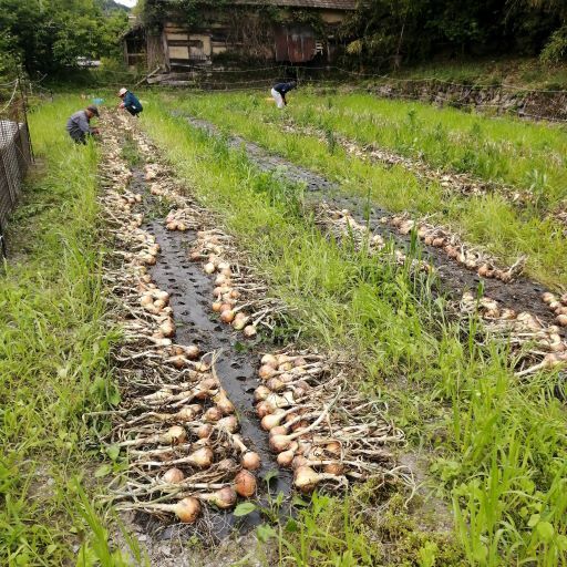 楽しそうに玉ねぎを抜いている姿や、めんどくさそうに根を切っている表情、休憩中の笑顔、そして大量の玉ねぎ。