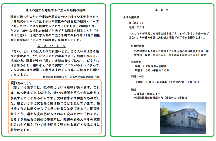 特定非営利活動法人まるさき福祉会は生活介護事業として令和4年4月に「燈」(あかり)を立ち上げました。