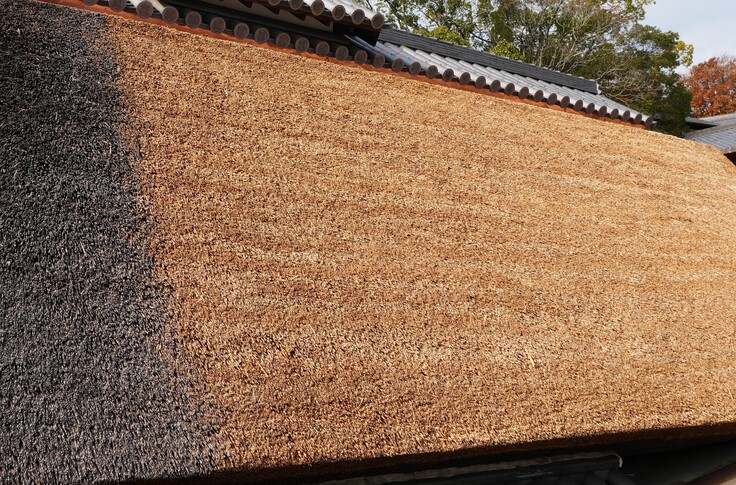 写真を見ていただくと分かるように、茅葺屋根は数か月で色が変わります。最後に修繕をした箇所だけはまだ黄金色を残しております。