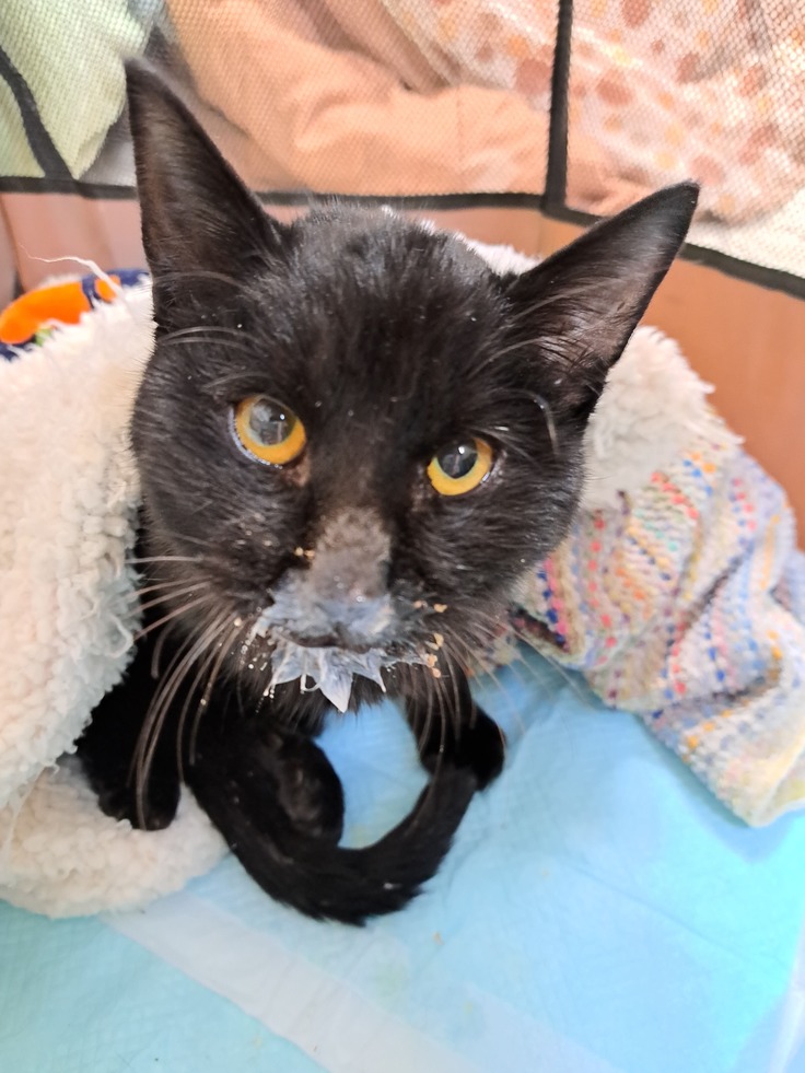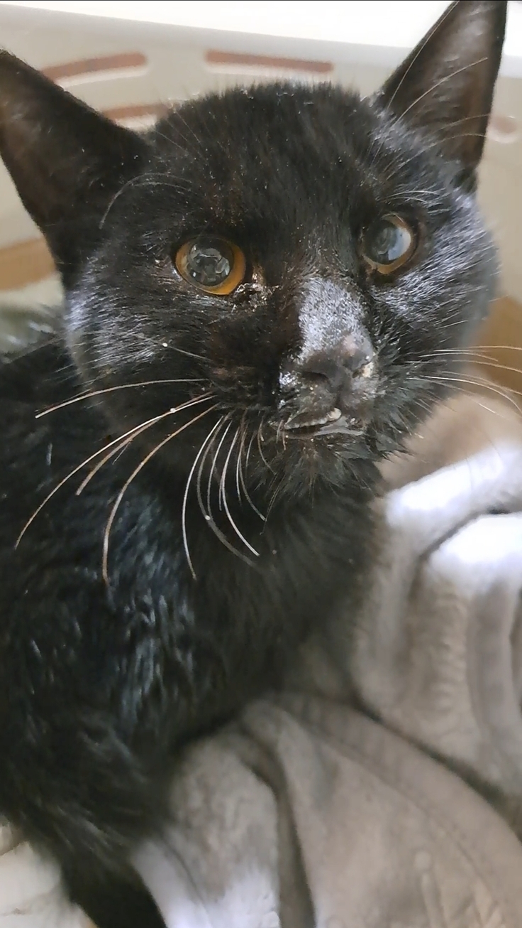 顎の骨がズレ、口蓋裂もある為子猫ミルクやご飯が鼻から出てしまい、お顔がきちゃなくなりますが、一生懸命生きています。