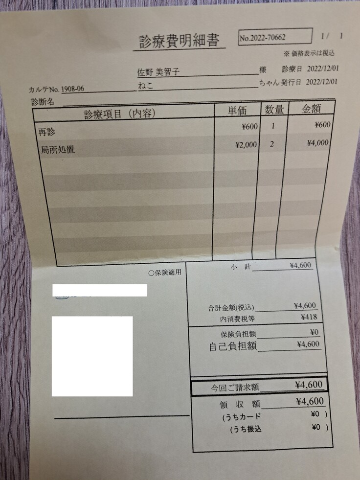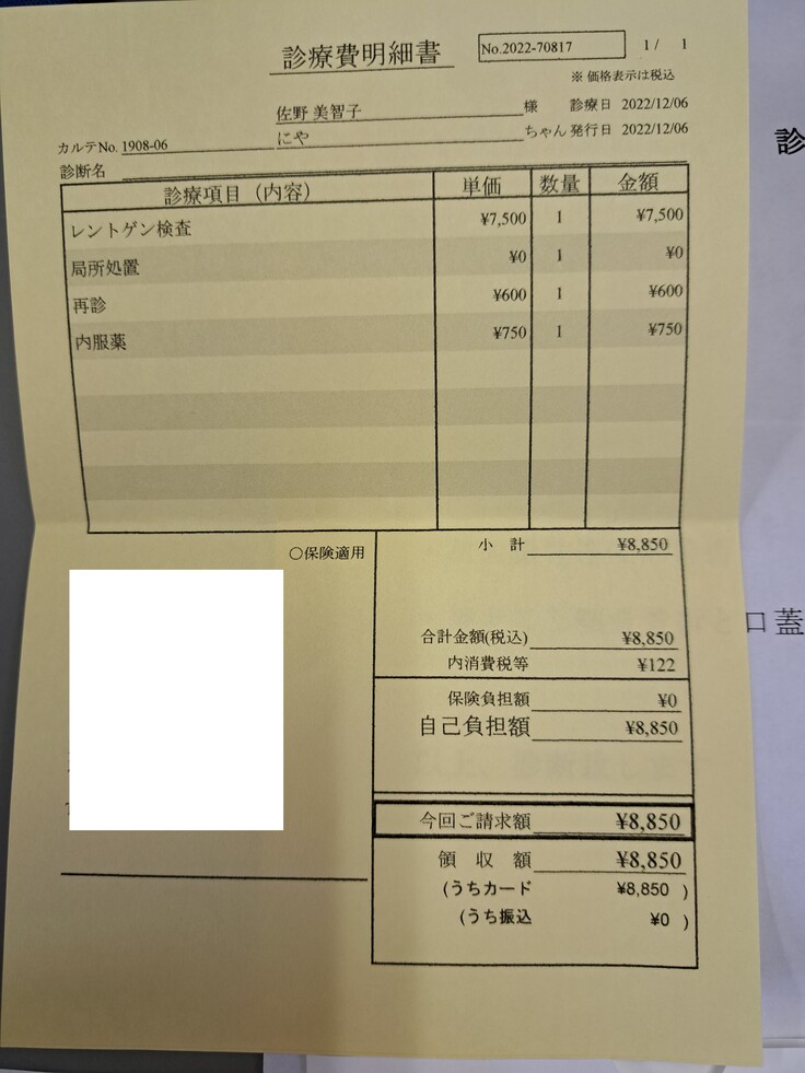 ・剥離骨折箇所の化膿治療及び投薬 約4600円/日