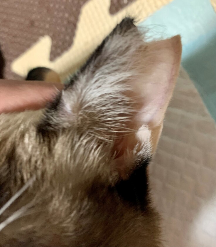 「桜耳」、桜の花びらの様に耳をカットします。これが避妊手術済みの証です。