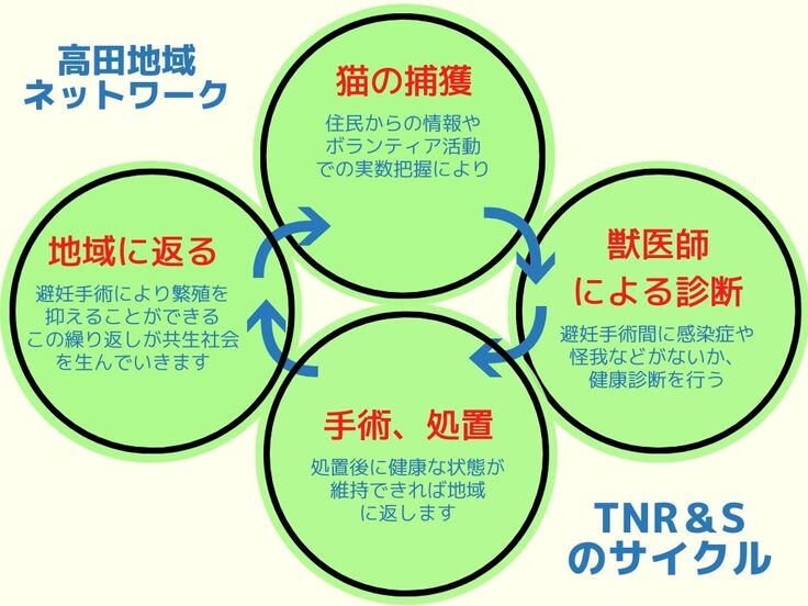 高田地域ネットワークでは「TNR&S」によって殺処分の減少に取組んでいます。