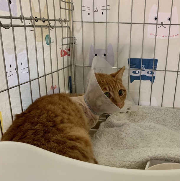 年末にTNR現場で自分の餌場でない地域で自らお腹が空いて捕獲器入ってくれた茶トラくん 手術の時に見たら右手が肘あたりで欠損しており痛々しく本院へ転院させ可哀想でしたが保護と決め肩より切断しました。無事昨日退院して傷口も綺麗な上ご飯も不安ながらやと思いますが食べてくれています。