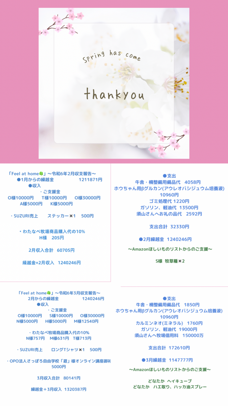 大変おそくなりましたが、2月、3月の収支報告を致します。