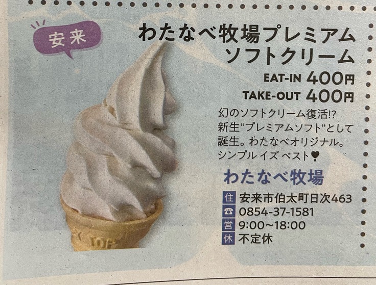 山陰中央新報の生活応援情報誌リビエールの夏のスイーツ特集にわたなべ牧場のソフトクリーム🍦が載ってました✨