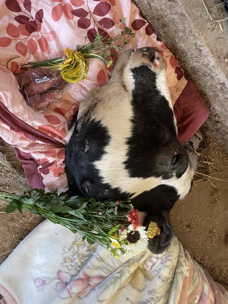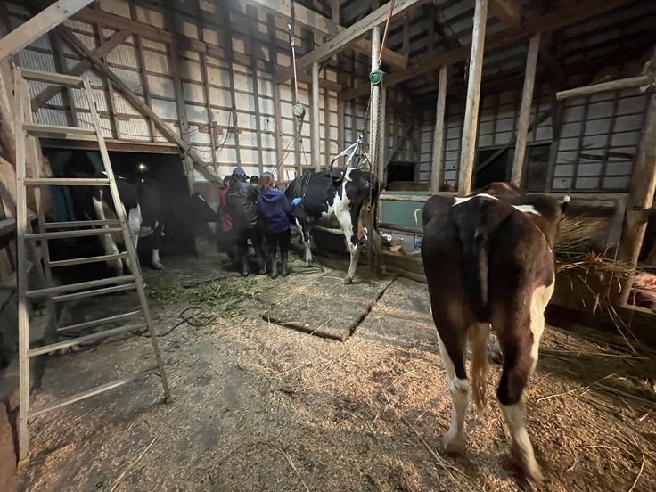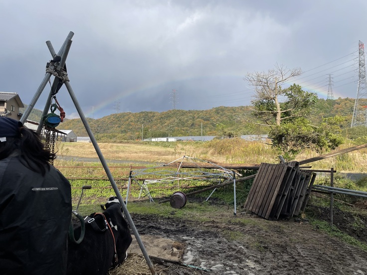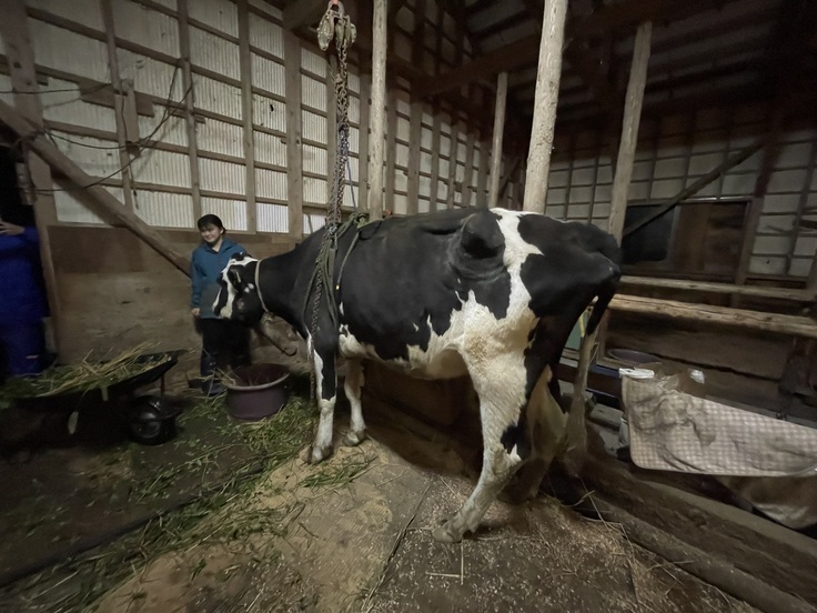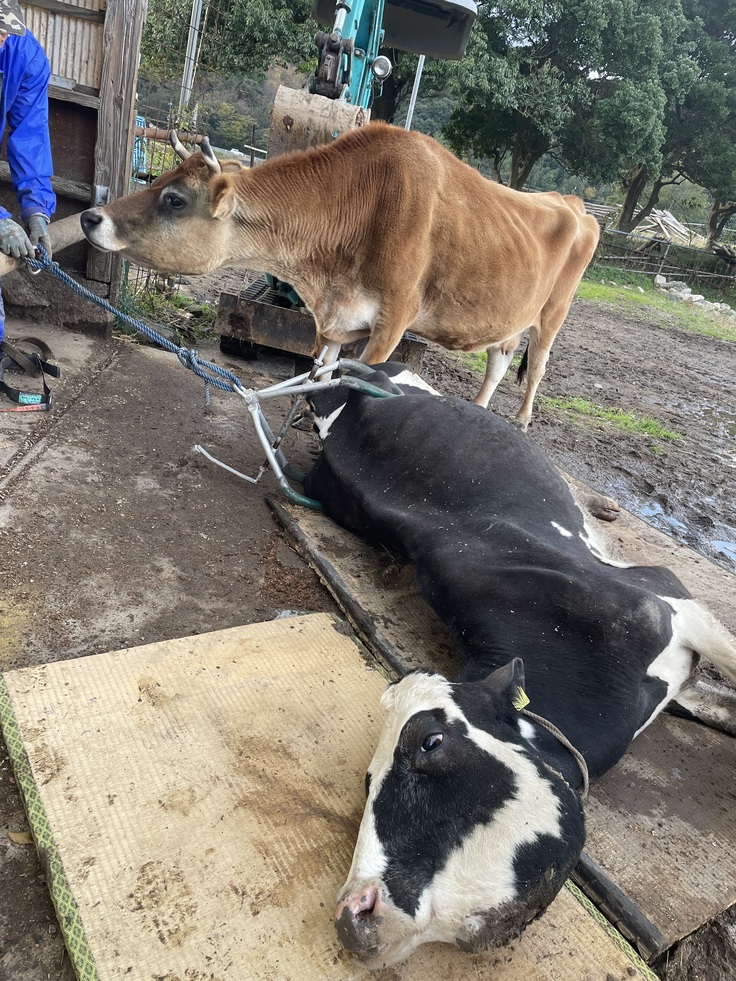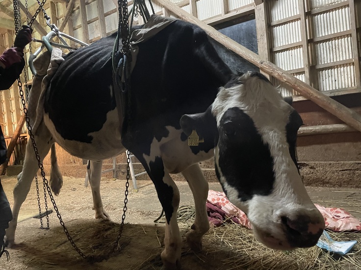 立て亡くなった翌日、外からお父さんに牛舎の中に移動させてもらい、その日はチェーンブロックで立たせると自力保持が出来、食欲もありました。