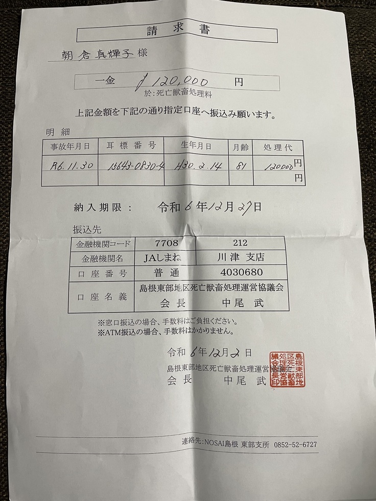 それから、昨日、ホウの遺体処理のためのお金をお支払いしてきました。医療費は、もう少し先に請求書が来ると思いますので、また報告致します。
