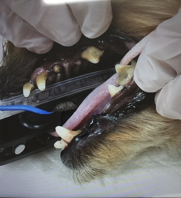 レスキュー後すぐ。約4歳で歯周病で歯はボロボロ。5~6本抜歯して歯垢除去してもらいました。また、皮膚や耳の治療や避妊手術(子宮の病気を防ぐため)も行いました。