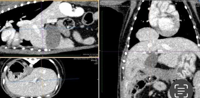 肝臓の一部が横隔膜を突き抜けて肺を圧迫しており、年々肝臓が胸部に移行しています。胸部へ移動している肝臓の大きさは2年で2倍になり、このままでは肺が圧迫され急な呼吸困難で亡くなる可能性が高く手術が必要です。