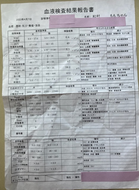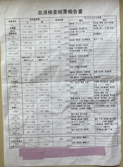 4月東京の動物医療センターにてCT。血液検査の結果。