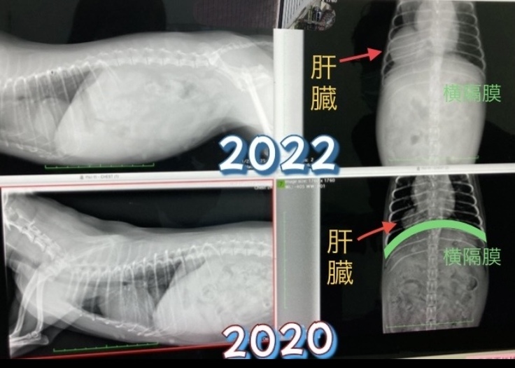 これまで3か月に一回の定期的なレントゲンと血液検査をしてきましたが、2022年11月のレントゲン検査で2年で肝臓が胸部側へ2倍移行していることが分かり、手術を勧められました。