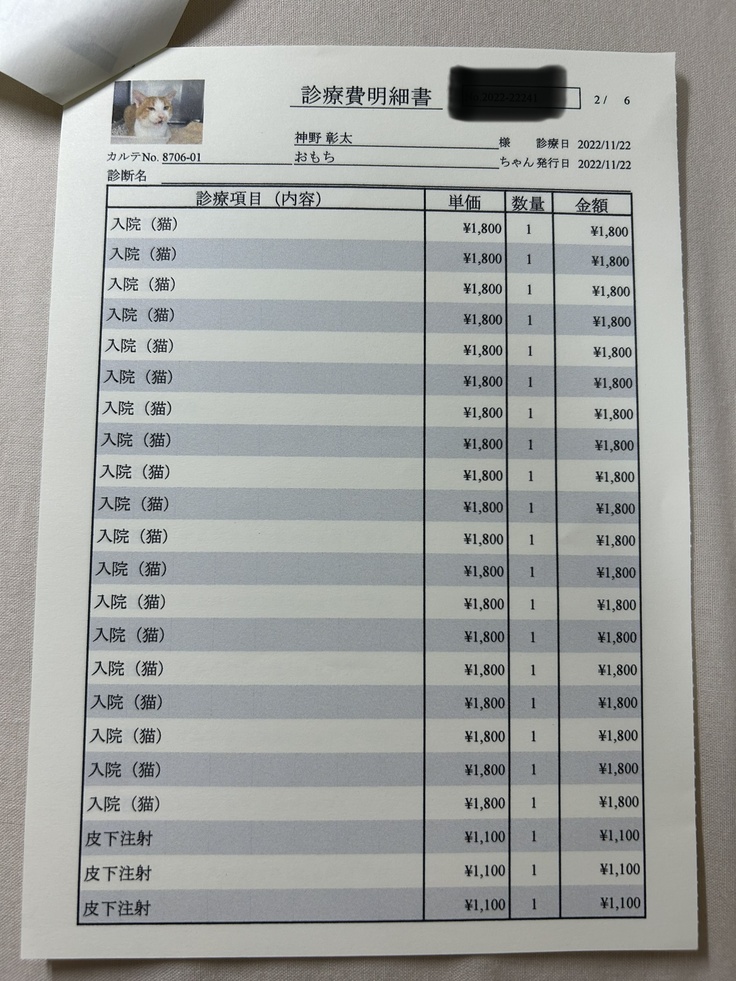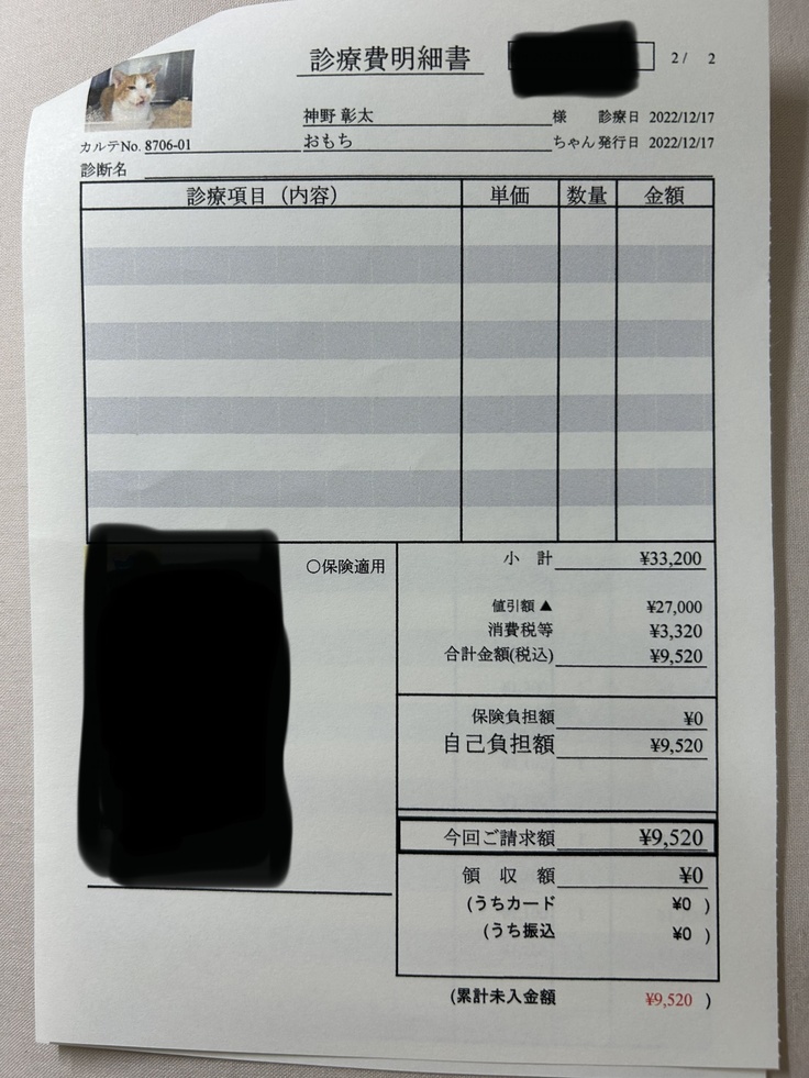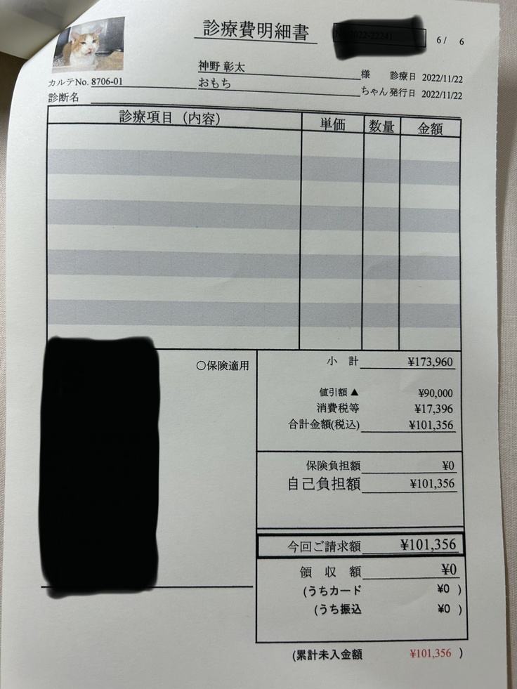 プロジェクト実施責任者又はその配偶者が、おもちの2022年11月22日の手術費用、その後の通院費用、療法食の購入に使用させていただきます。