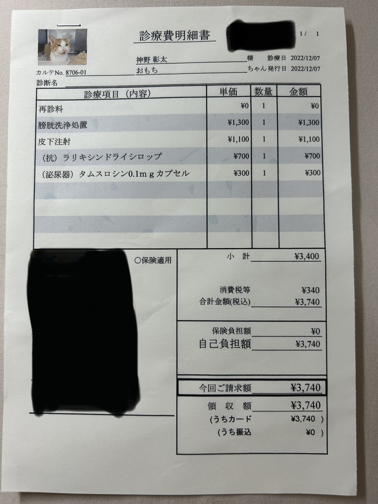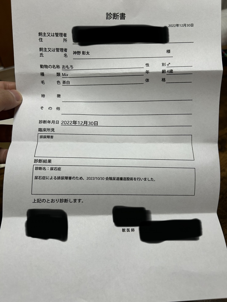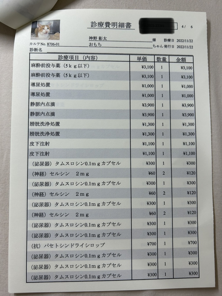おもちの場合、なるべく早く太い尿道をつくるための手術を行うことが最善だと医師から助言があり、手術費用約10万円程度の手術をしていただきました。しかし、手術後も容態が安定せず再手術の可能性が出たこと、定期的に尿道の確認のための診察が必要なこと、療方食を生涯買い続けなければいけないことなど、これからも万単位での治療費がかかります。