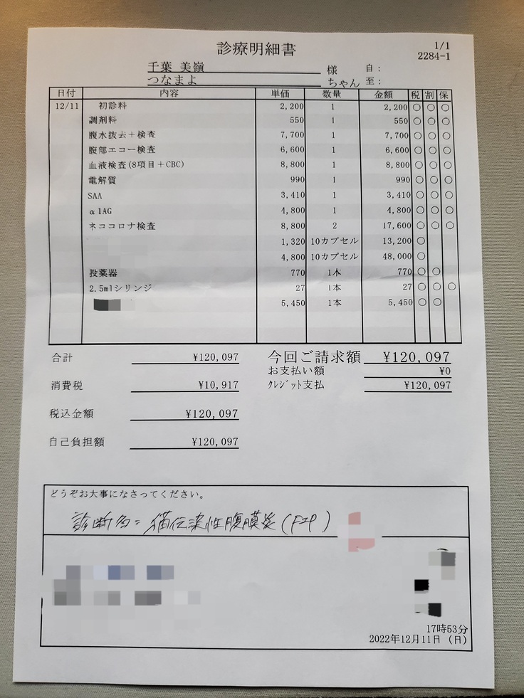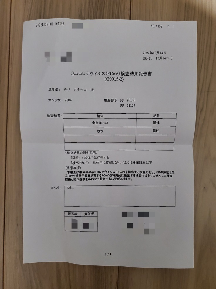 結果はFIP(猫伝染性腹膜炎)で確定とのことでした。