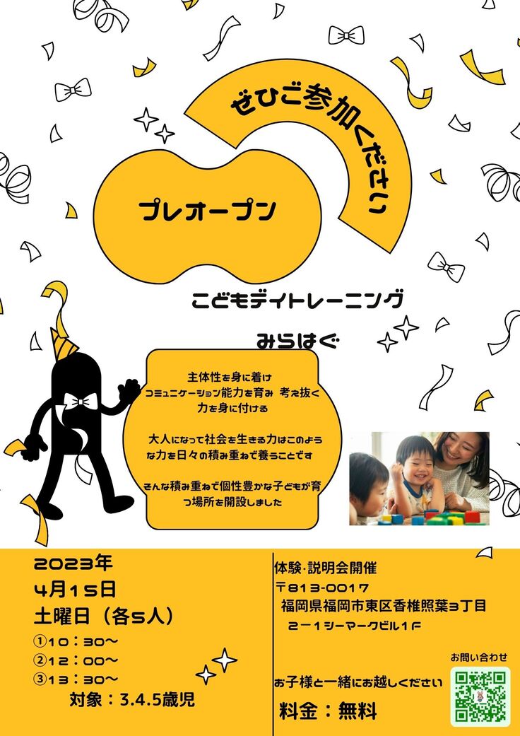現在、施設を開設する場所はみつかり、スタッフも確保できており、5月6日に「こどもデイトレーニングみらはぐ」を開所する運びになっております。(福岡市東区照葉アイランドシティー シーマークビル内)