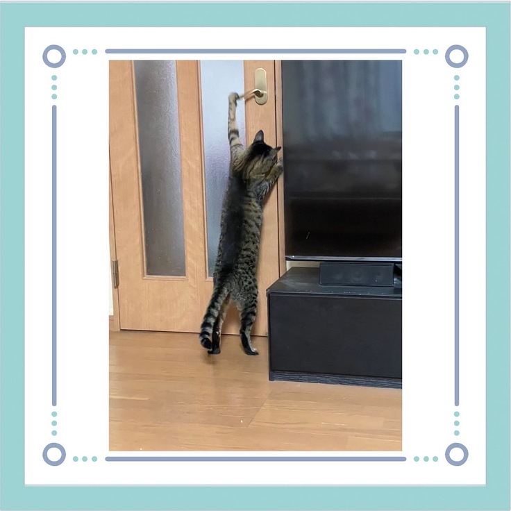 そしてパパおかえりからの脱走!をはかります。ちかちは大きいので、痩せてしまった今でもドアノブに届きます。