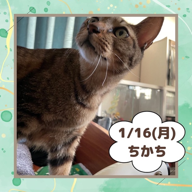 見上げるちかち、美しいおめめと口元にチラッと牙が見えてキュートです︎💕