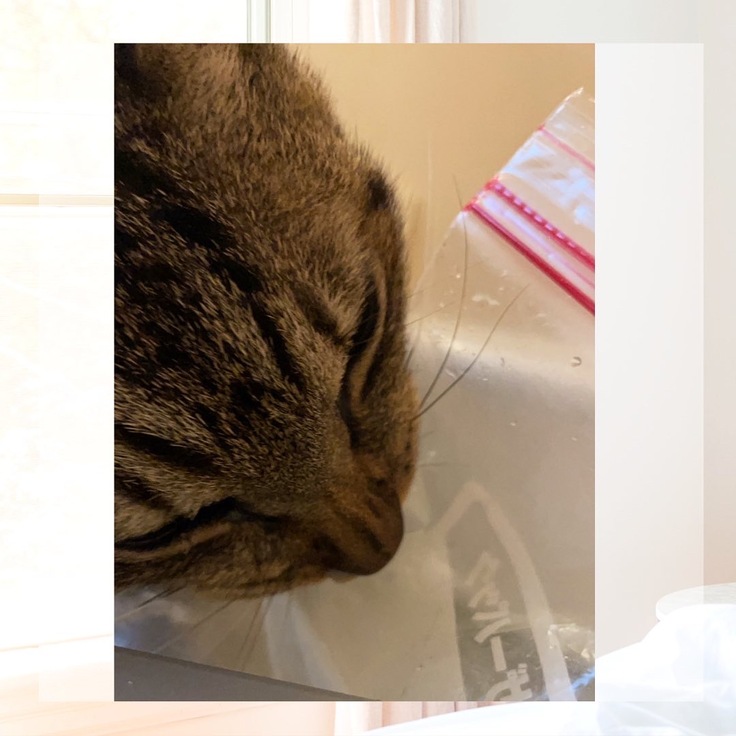 悪い顔して、携帯を入れてるジップロックを噛んでいます。