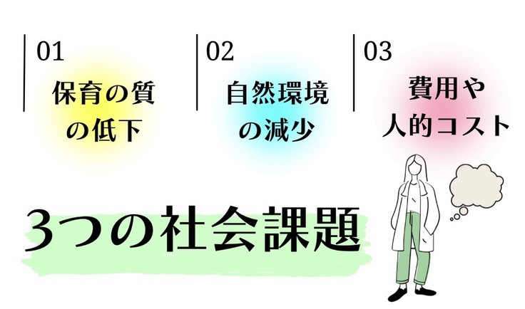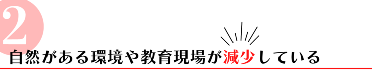EVERGREEN緑化プロジェクトを詳しくご説明する前に、こどもたちの生きる力を育むために必要な自然環境(緑化)が減っていってることで起こる「3つの社会課題」についてお話させてください。